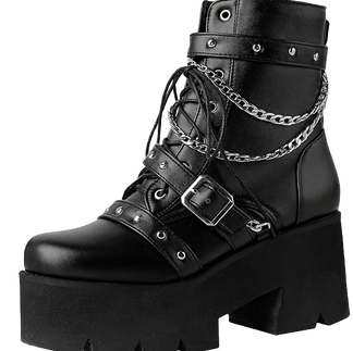 The Women Buckle Goth Chunky Platform Ankle Boots are a bold addition to any edgy wardrobe. With a striking lace-up design and high heel, they elevate your style. Adorned with chains, these motorcycle boots add a rebellious touch. Pair them with distressed jeans and a graphic tee for a casual look, or wear them with a flowing black dress for gothic elegance. The chunky platform ensures comfort while enhancing your silhouette, making these boots a versatile fashion statement.